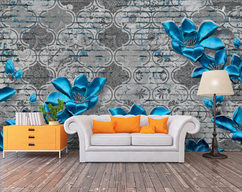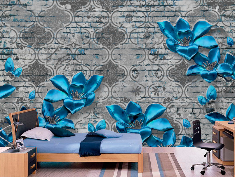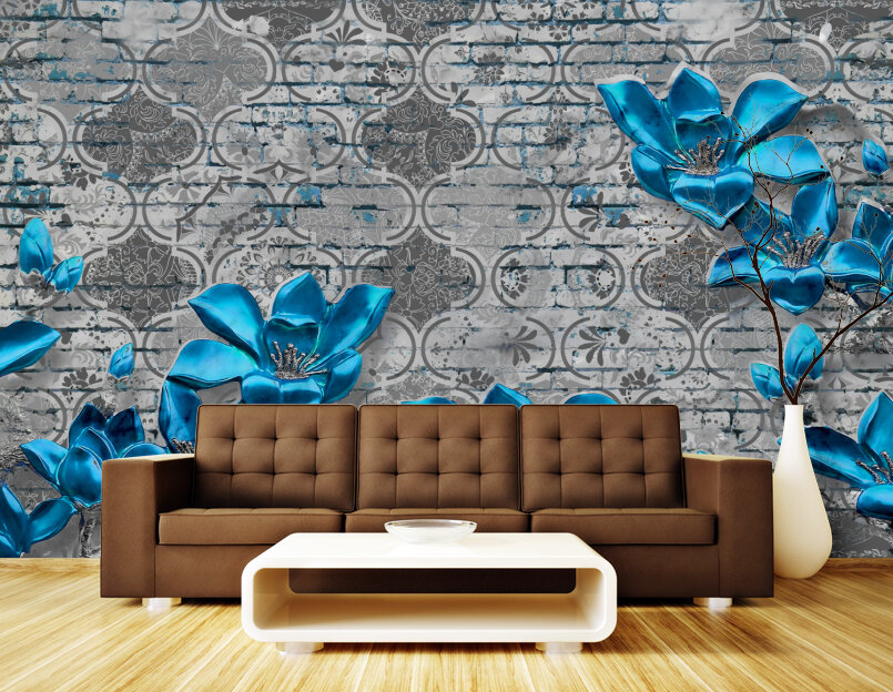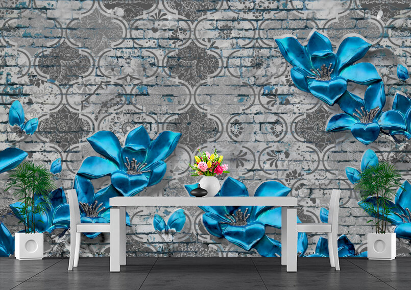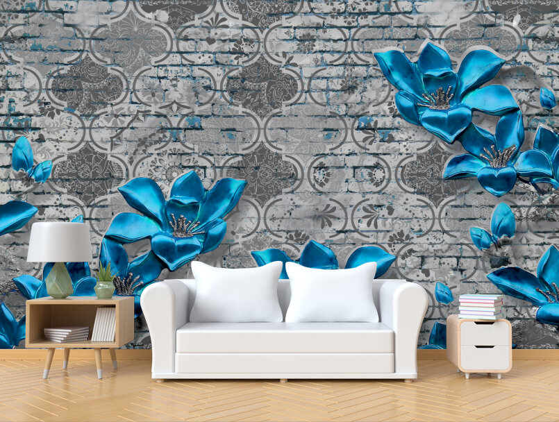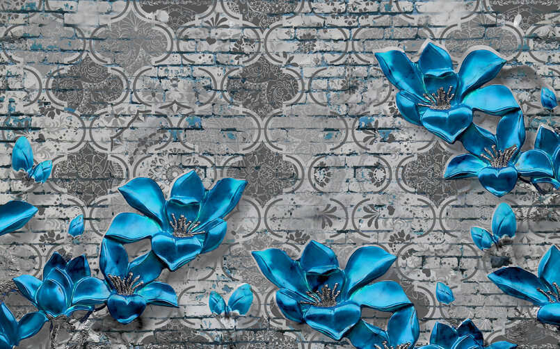 3D Бирюзовые магнолии на сером фактурном фоне Артикул: FS_542