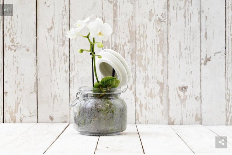 Белая орхидея в банке на столе из дерева Артикул: FS_1287