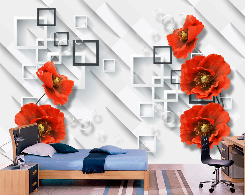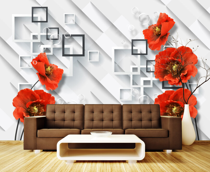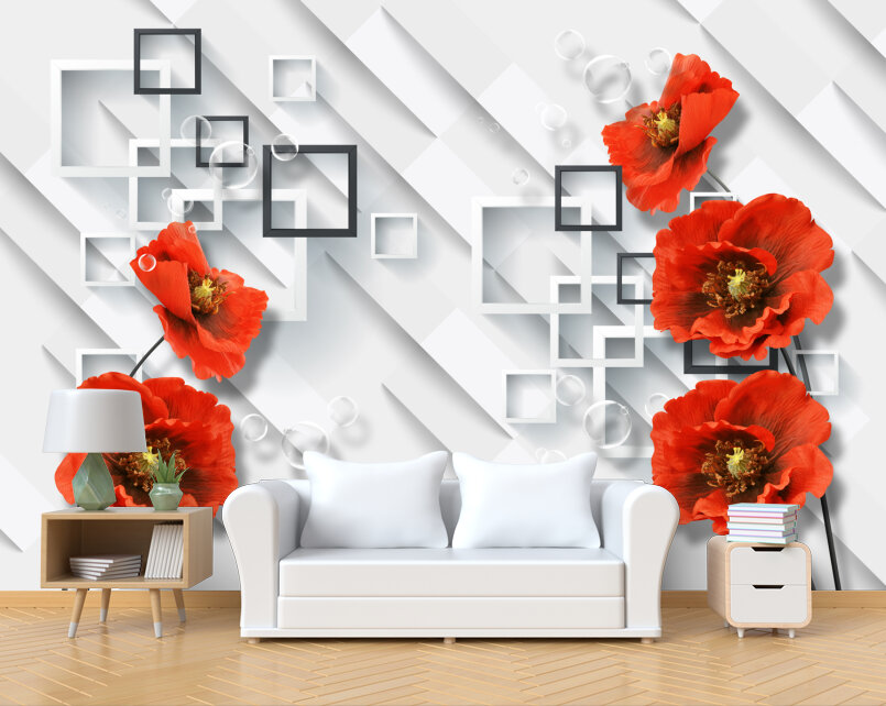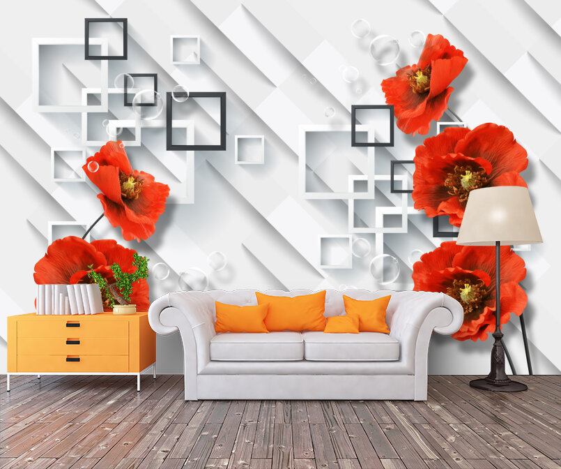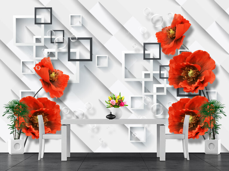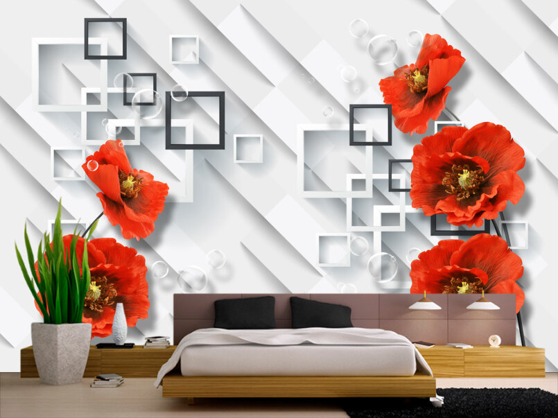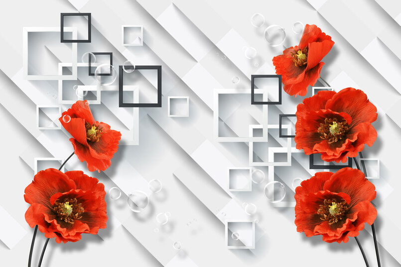 3D Красные маки на объемном фоне с квадратами Артикул: FS_495