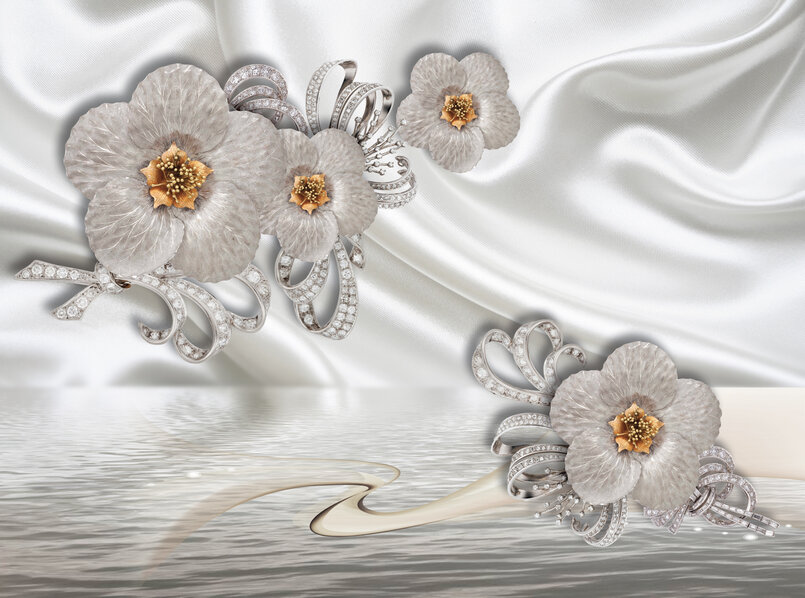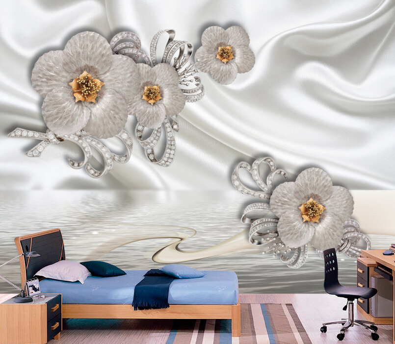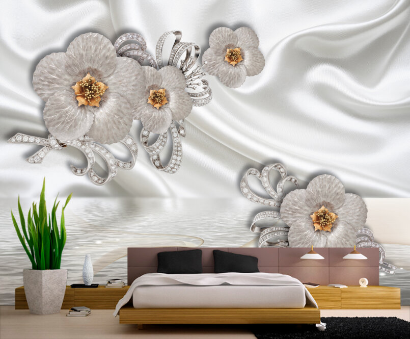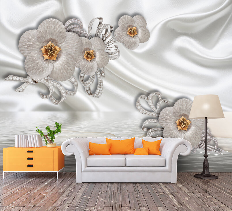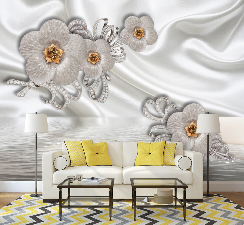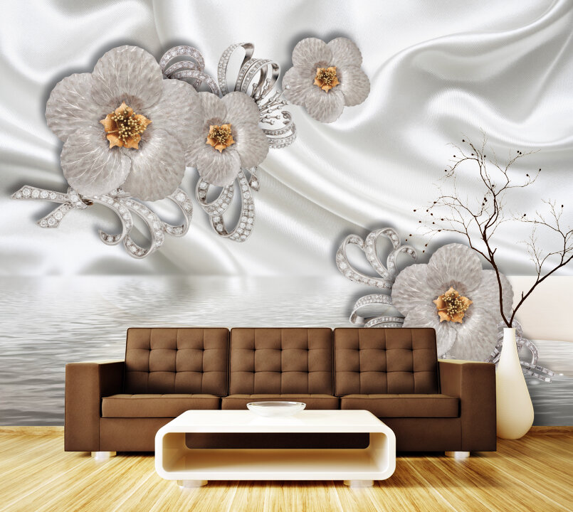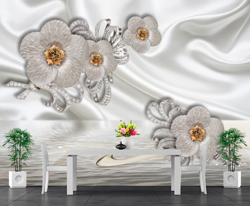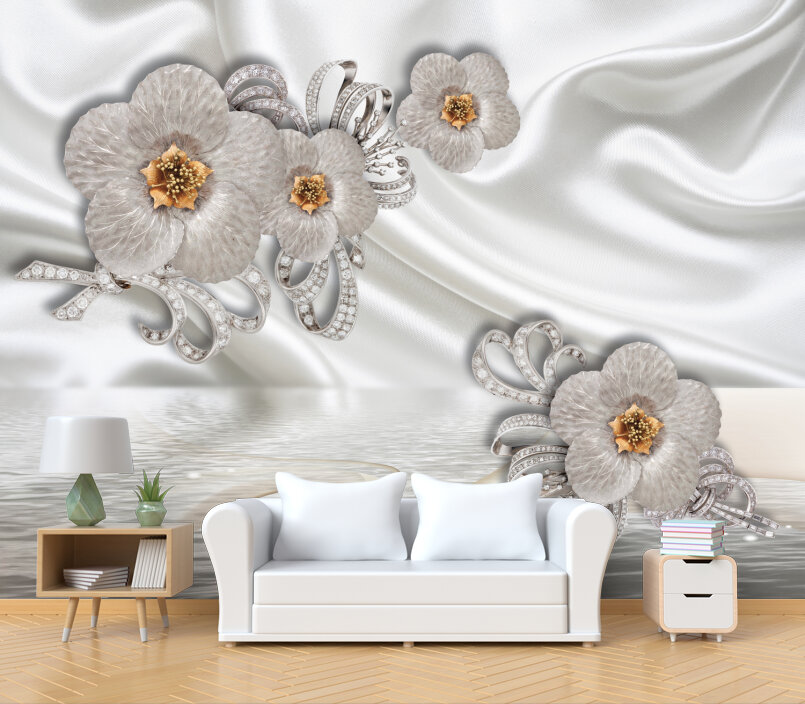 3D Серебряные цветы на белом шелке Артикул: FS_557